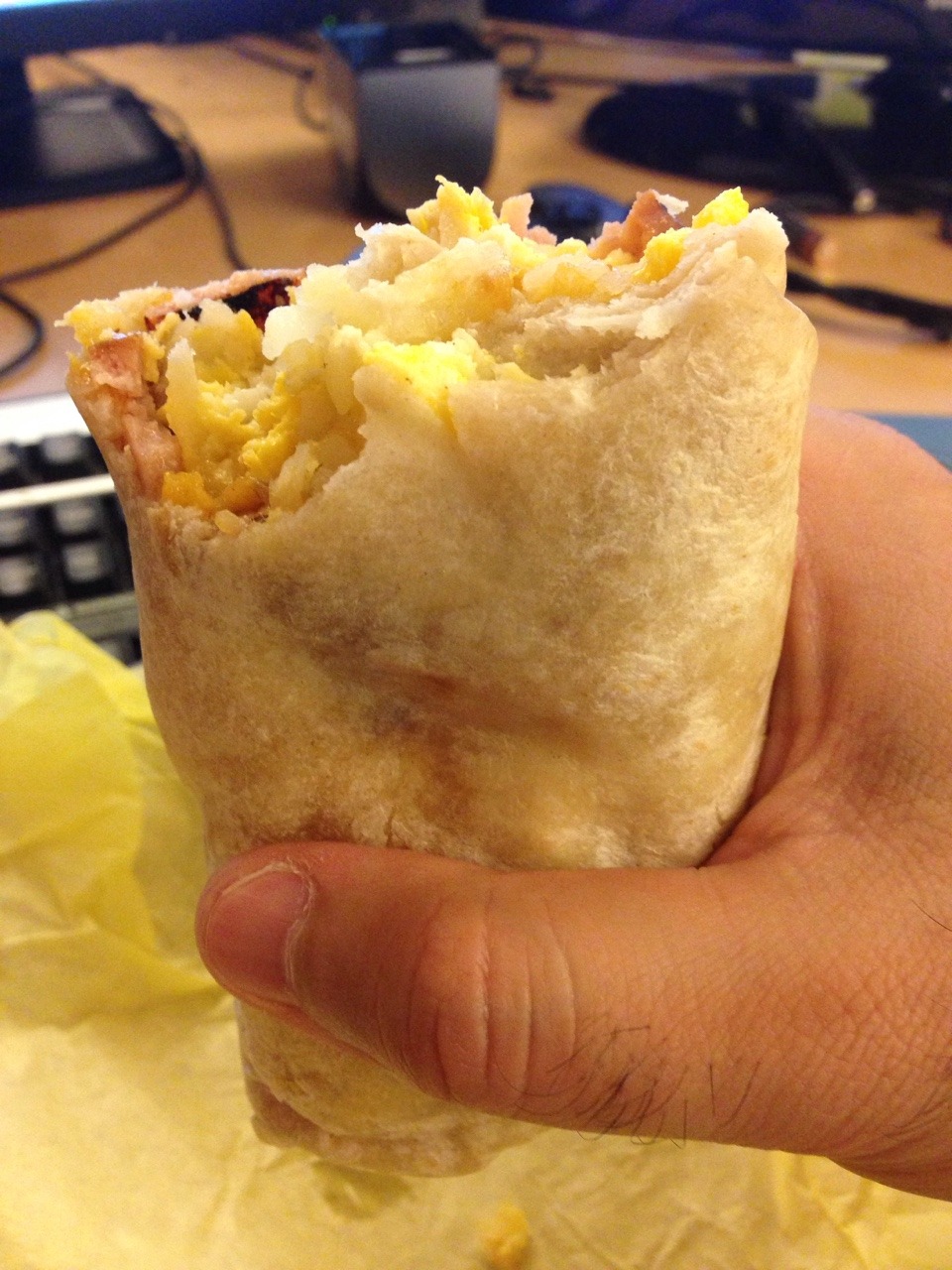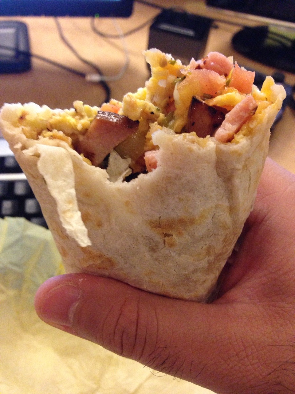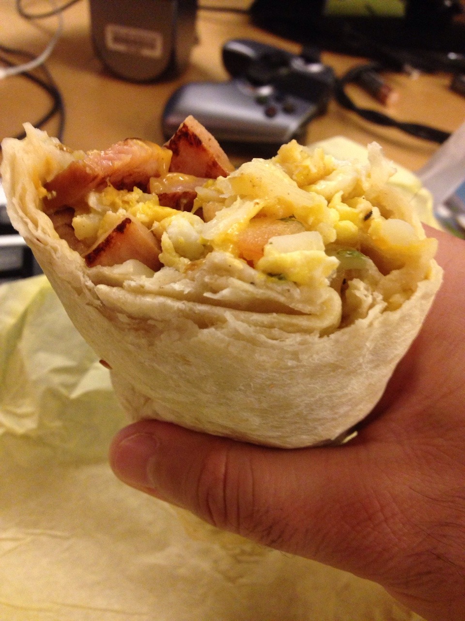 Ham breakfast burrito from Latte Express on Bluxome Street. San Francisco, CA.