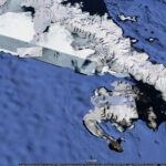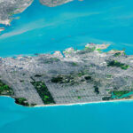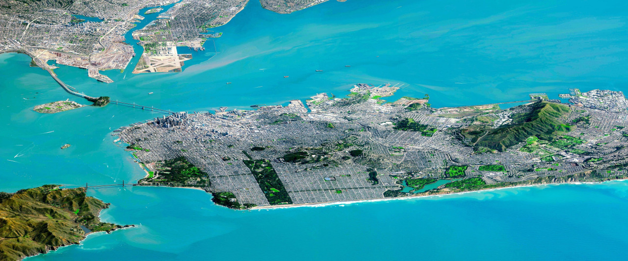 We’re so excited that we got to include this image of San Francisco, California, and the surrounding Bay Area, in the book’s section about water. Home to some eight million people, the region was captured here by satellite at a low angle from 800 miles away over the Pacific Ocean. When freshwater from inland California mixes with salty water coming from the ocean, it creates brackish wetlands that provide a vibrant habitat for wildlife, including many species of birds. Over the last century, nearly 80 percent of the Bay’s wetland habitats have been diked and filled for building, farming, and salt extraction.