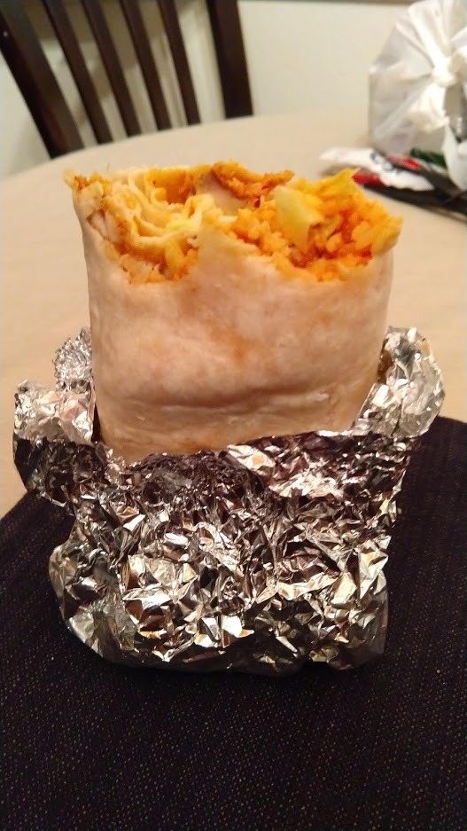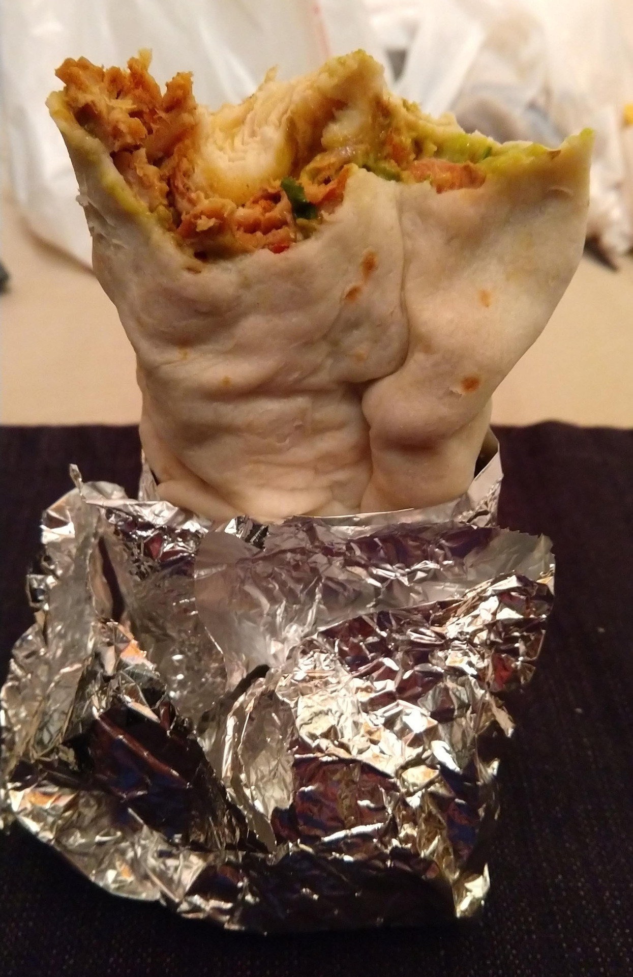 The signature Una Mas burrito with chicken. I made the mistake of refrigerating this one and no reheated burrito can hold up its original form. Still, a nice middle of the road experience. The Super Mario of burritos.