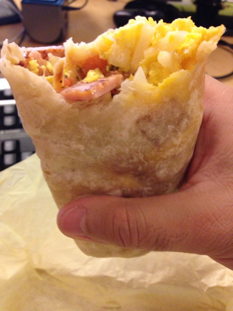 Ham breakfast burrito from Latte Express on Bluxome Street. San Francisco, CA.