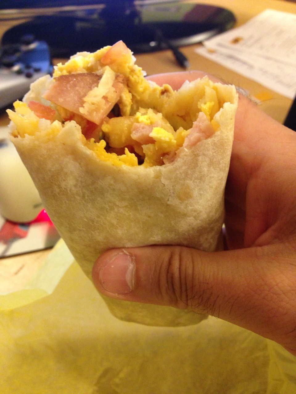 Ham breakfast burrito from Latte Express on Bluxome Street. San Francisco, CA.