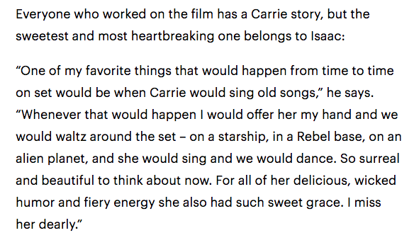 “One of my favorite things that would happen from time to time on set would be when Carrie would sing old songs,” he says. “Whenever that would happen I would offer her my hand and we would waltz around the set – on a starship, in a Rebel base, on an alien planet, and she would sing and we would dance. So surreal and beautiful to think about now. For all of her delicious, wicked humor and fiery energy she also had such sweet grace. I miss her dearly.”
