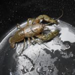 Lobster in a bucket looks like a gigantic monster on a metallic planet, and the waterdrops look like stars.
